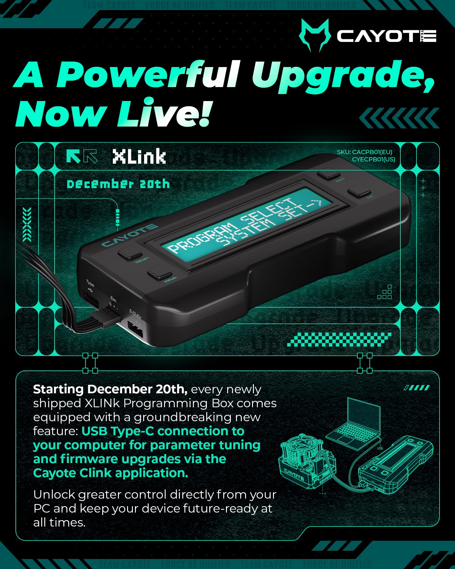 Mit einer benutzerfreundlichen LCD-Schnittstelle sorgt das Cayote Xlink-System dafür, dass das Programmieren des Reglers jetzt schnell und unkompliziert erledigt wird. Passe Einstellungen mühelos an, egal ob auf der Rennstrecke oder in der Werkstatt. Kompakt und tragbar ist es ein ultimativer Begleiter an der Strecke.