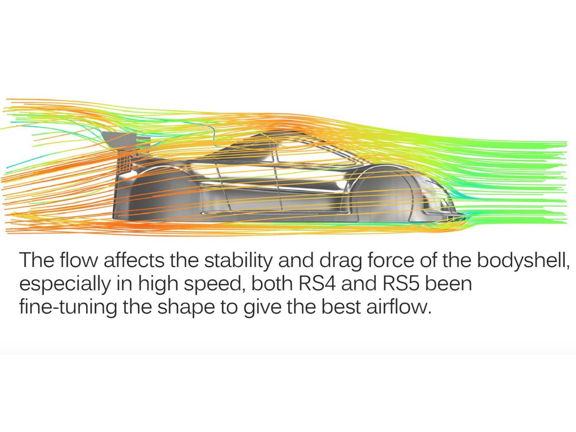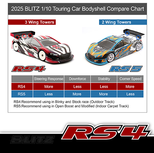 Der RS4 hat ein neues Design des Mittelflügelturms, das die Heckstabilität erhöht, ohne die Höchstgeschwindigkeit zu beeinträchtigen. Die RS4-Karosserie ist in drei verschiedenen Stärken erhältlich.